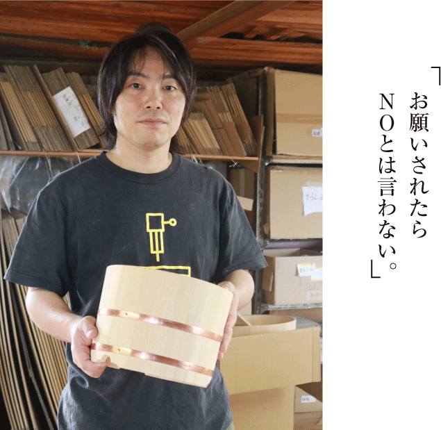 昔、桶屋は今のコンビニぐらいたくさんあったようです。現在は全国で40〜50軒。一度淘汰された商品を再び売り込んでいくのは相当難しいなと実感しています。「なくてもいいもの」を「欲しいもの」「なくてはならないもの」に変えていきたいと思っています。一方で、現在はそもそも桶を作っている人が少ないから、何をやっても全部新しい挑戦になる、というのも面白いところです。