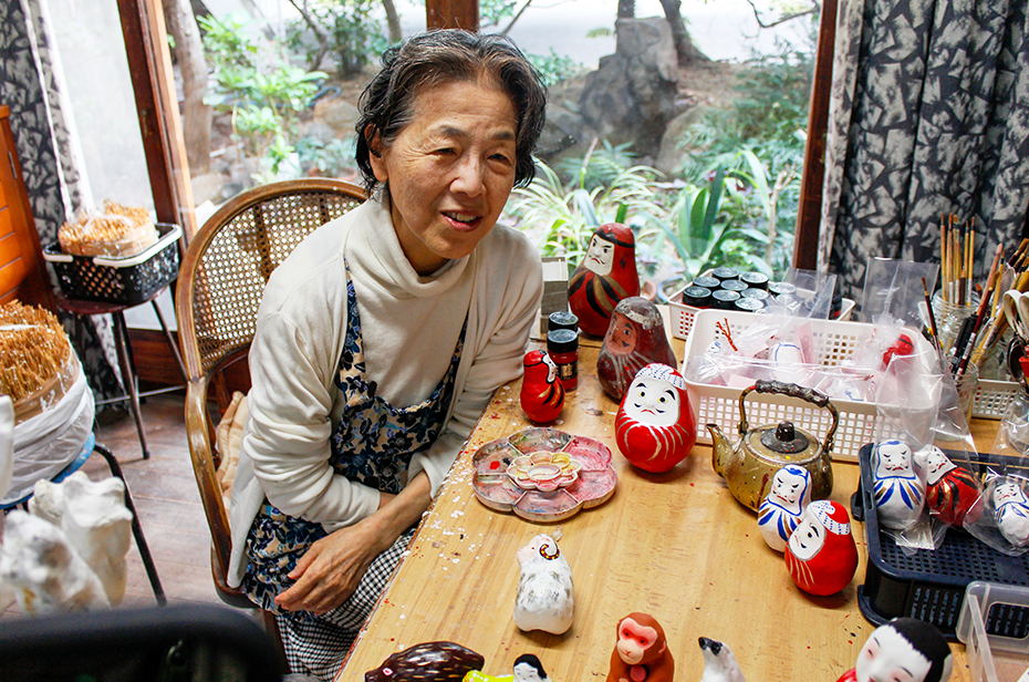 子どもの健やかな成長を願う親心が込められた高松張子。手描きならではの素朴なタッチが魅力で、手に取ってみるとその愛らしさにほっと心がほぐれる。庶民に長く愛されてきたわけだ。伝統工芸士・乃村七重さんは、先代の意匠を受け継ぎつつも、自分らしい張子作りに取り組んでいる。生きいきとした色づかいと柔和な顔立ち。のんびりと穏やかな乃村さんの人柄を映し出しているようだ。
