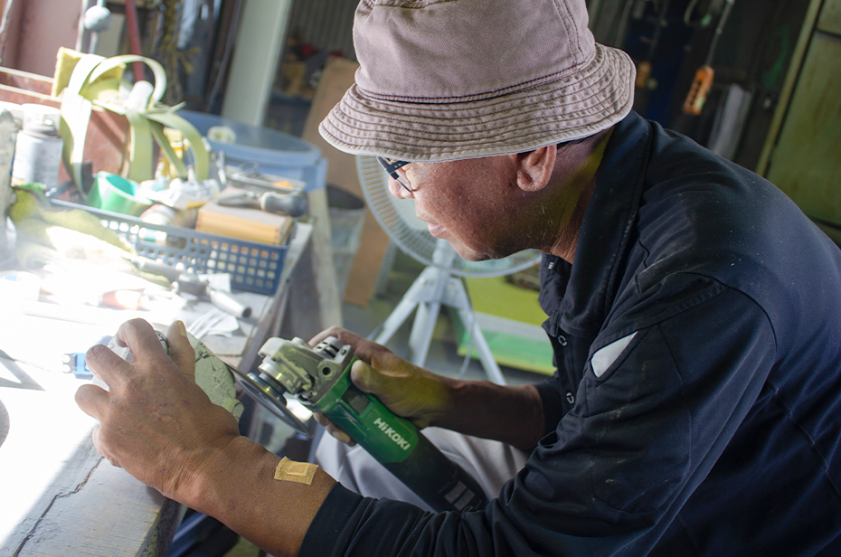 特殊な加工といえば、と全国から依頼を受けるという兎子尾さん。臆することない柔軟な姿勢と、あらゆる注文に応える腕前を頼りにする人も多く、時には現代アーティストと制作をすることも。その一方で、昔ながらの手法を再現し、自ら鍛冶で道具を鍛え、城の石垣などの文化財修復にも携わっている。