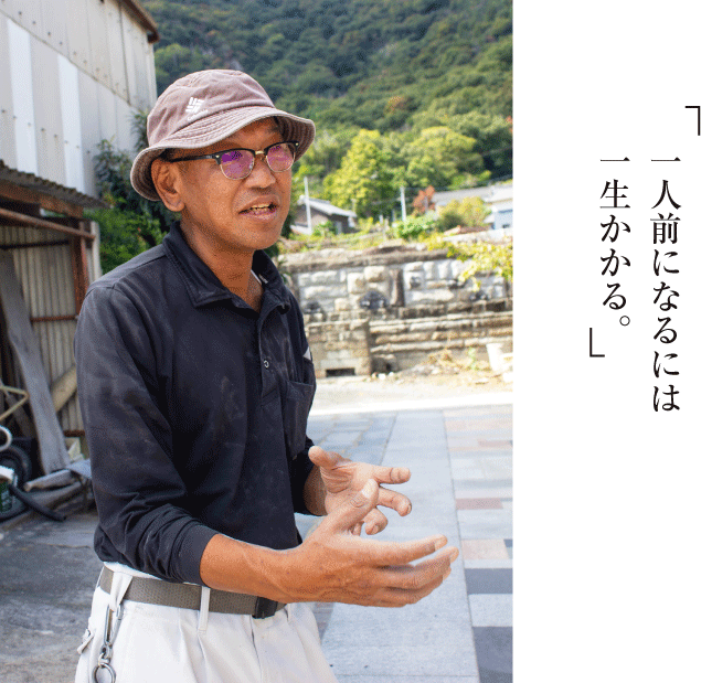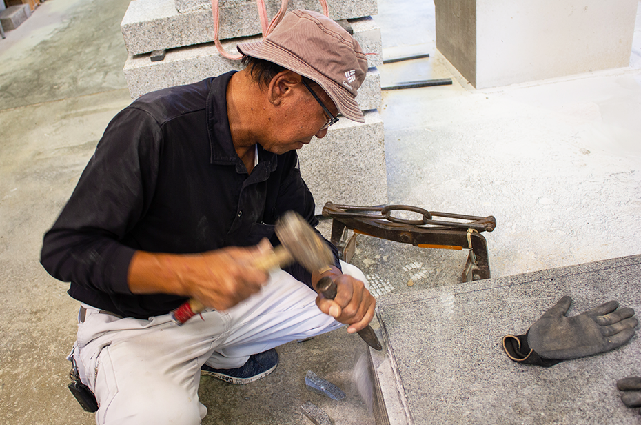 物心ついた頃から掃除や手伝いで石は身近にありましたが、大学では文学部に。学生生活を楽しみ、コンビニでアルバイトをしたりもしましたが、ふと「これって何も残らないな」と気づいて。対して石は長く残るものです。ものづくりの楽しさを思い出しました。そんなとき祖父が体を壊したのがきっかけで実家に戻ることにしました。現在職人は6人。息子も「石屋をしたい」と帰ってきて働いています。