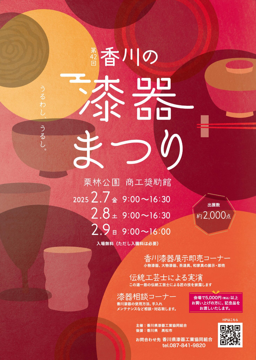 2月 7 日(金)より、栗林公園商工奨励館にて「漆器まつり」が始まります。色も形も手触りも様々な香川の漆器が一堂に集まる、見て触れて選べる機会! 出展数は約 2000 点です!